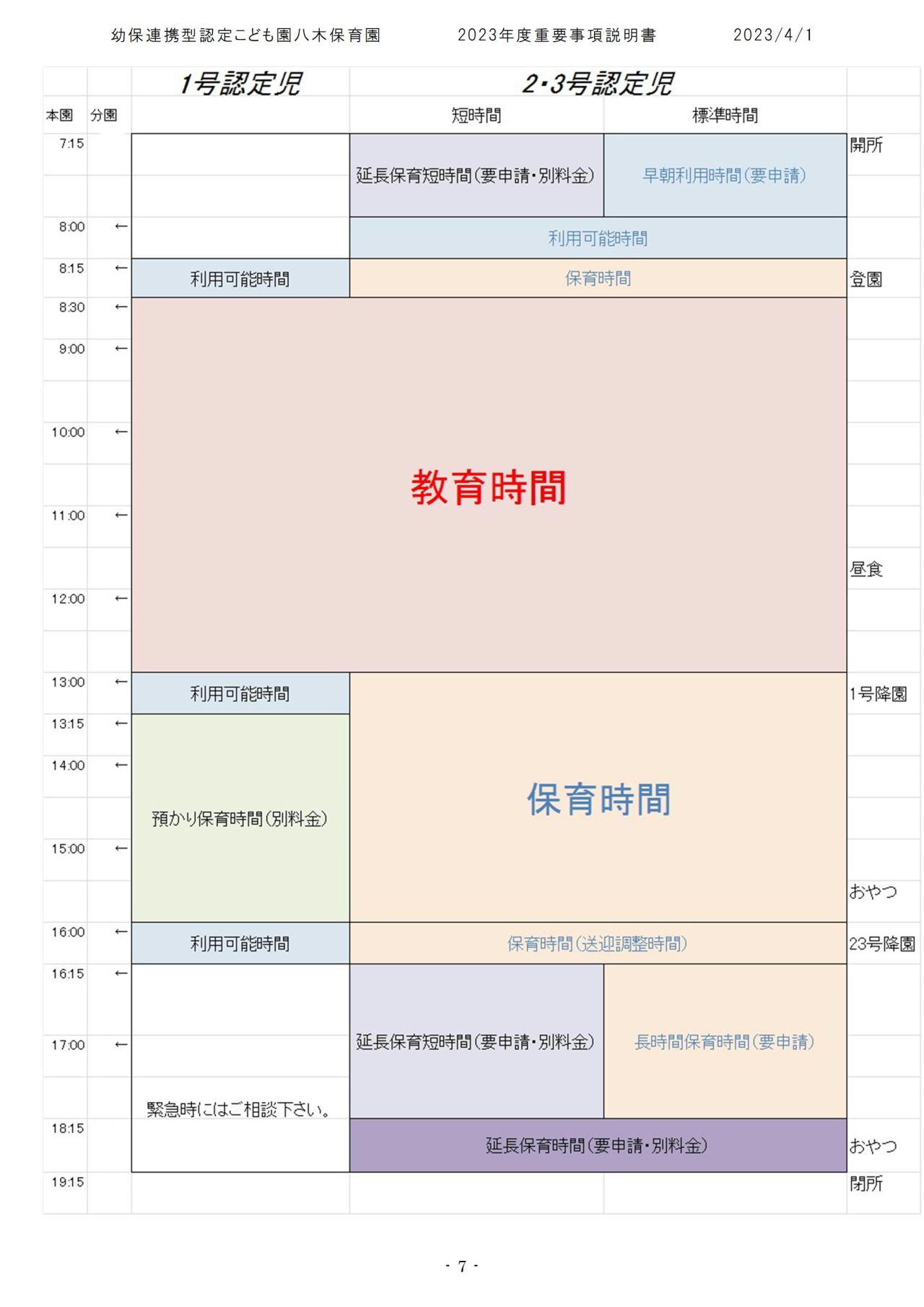 2号児・3号児の利用できる時間は、基本的に同じです。ただし、就労状況によって短時間利用認定(8:15~16:15、最大8時間)あるいは標準時間利用認定(7:15~18:15、最大11時間)に市が振り分けて認定します。それ以上利用する場合(18:15~19:15、最大延長1時間)は追加料金がかかります。